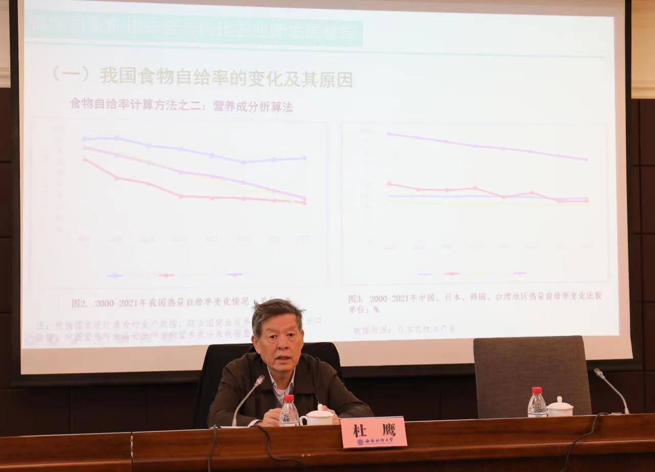 杜鹰重点围绕“确保国家食物安全与构建农业新发展格局”“小农生产与农业现代化”两个方面进行全面系统阐述。他深入分析了我国食物自给率的变化情况和我国农业面临的挑战。他指出,国家粮食安全问题很大程度上已转化为食物安全问题。确保国家食物安全,要加快构建以国内大循环为主体、国内国际双循环相互促进的农业新发展格局。其中,国内大循环的关键是打好种业翻身仗,国际循环的关键是打造海外供应链。