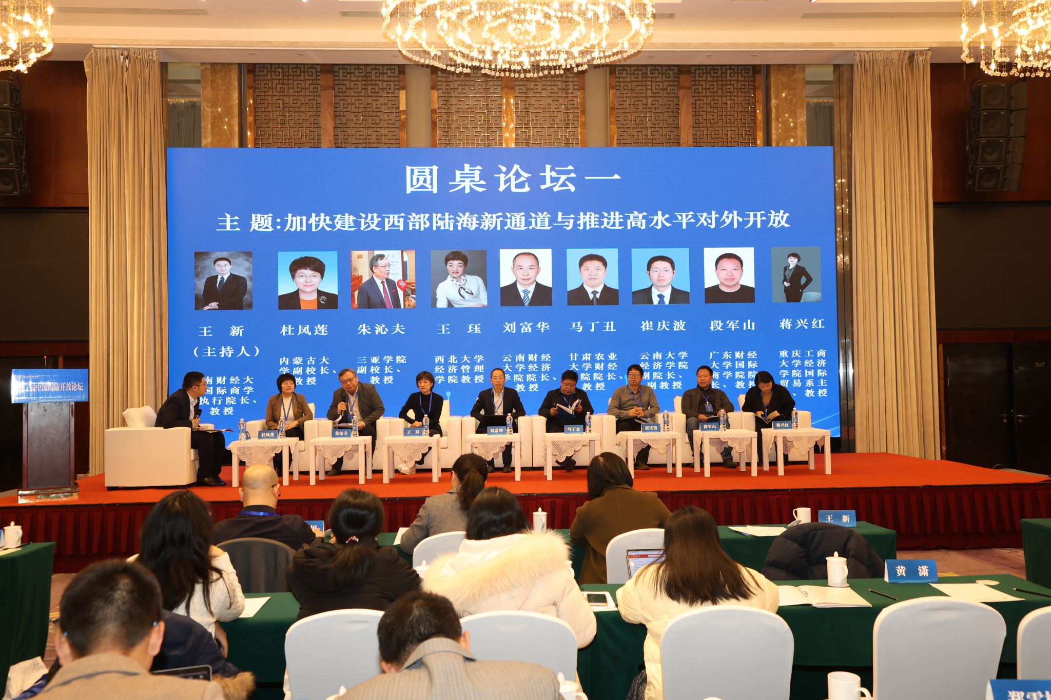 随后举行了三场圆桌论坛。国际商学院执行院长王新主持以“加快建设西部陆海新通道与推进高水平对外开放”为主题的圆桌论坛。内蒙古大学副校长杜凤莲教授、三亚学院副校长朱沁夫教授、西北大学经济管理学院王珏教授、云南财经大学经济学院院长刘富华教授、甘肃农业大学财经学院院长马丁丑教授、云南大学经济学院副院长崔庆波副教授、广东财经大学国际商学院院长段军山教授、重庆工商大学经济学院国际贸易系主任蒋兴红教授分享了各自研究成果。